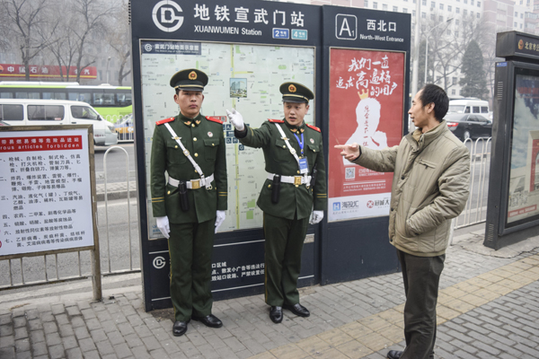 地铁宣武门站是换乘站,出口多、难辨别,正在这里执勤的七支队十一中队哨兵耐心地为乘客指路。 张文杰 摄