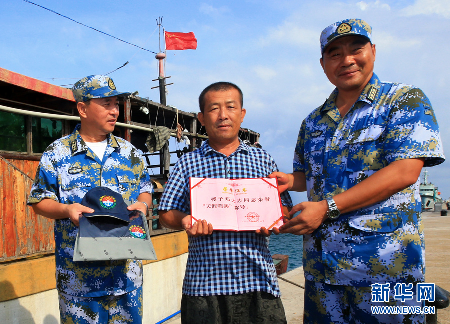 2013年5月17日,海军西沙水警区司令员刘堂(右一)将荣誉“天涯哨兵”荣誉证书授给邓大志(中)。新华社记者查春明摄