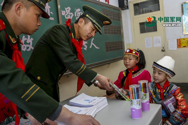 武警肃南森林大队三中队党支部书记赵新龙代表党支部与红湾小学两名贫困学生结成长期帮扶对子,并为其赠送学习用品。