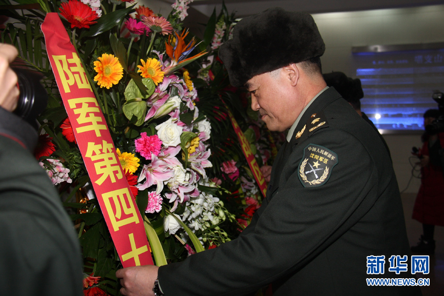 3月5日,第40集团军军长张学锋为向雷锋塑像敬献的花篮整理绶带。秦富梁摄