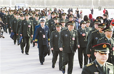 3月5日,第十二届全国人民代表大会第四次会议在北京人民大会堂开幕。图为军队人大代表步入会场。穆可双摄