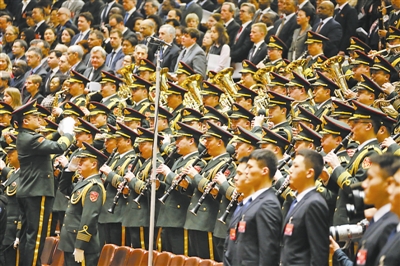 3月5日,第十二届全国人民代表大会第四次会议在北京人民大会堂开幕。图为军乐团演奏国歌。穆可双摄