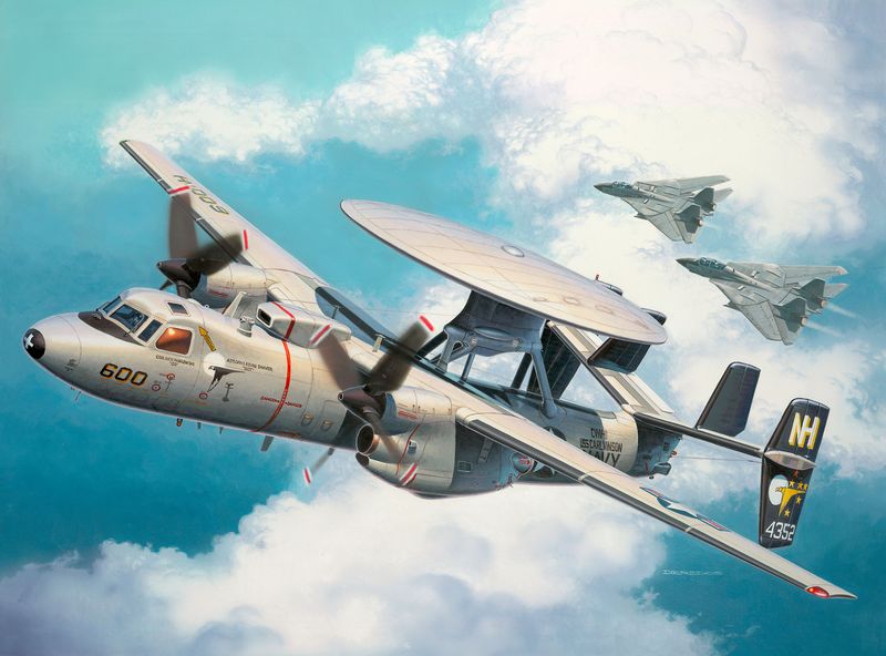 E-2C预警机封绘,背景中还有2架F-14战机。