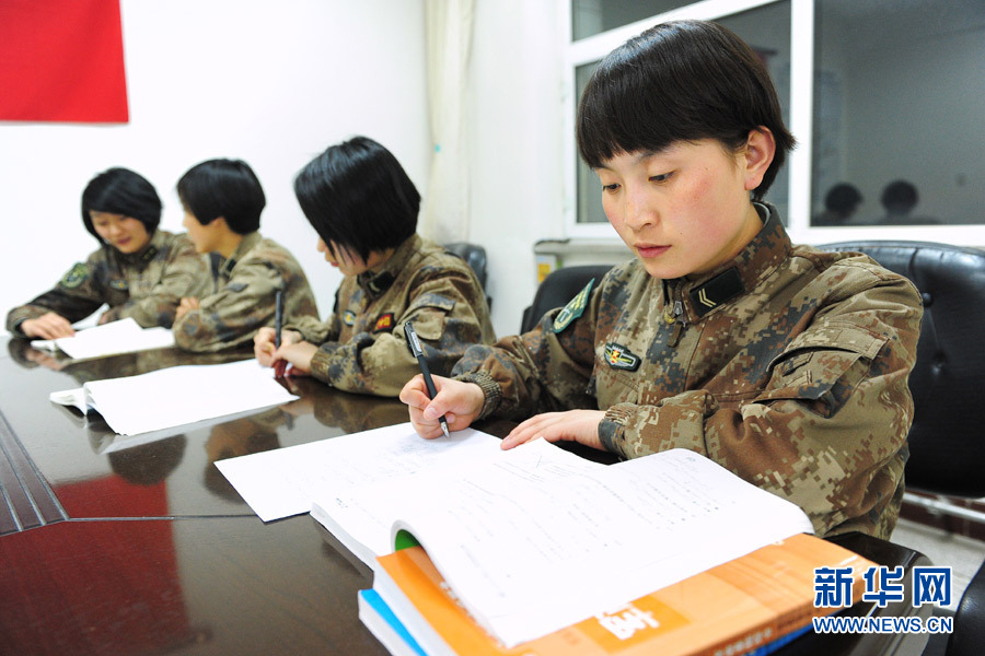 新疆哈密军分区通信站几名备考军校的女兵夜间在学习室里复习。肖晨晨 摄