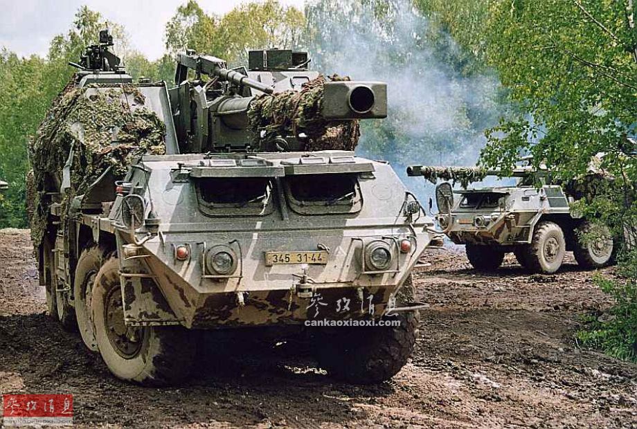 ShKH vz. 77“达纳”152毫米自行榴弹炮由捷克陆军于1970年研发,1981年正式投入服役。达纳是世界上第一种采用“任意角半自动装弹机”(火炮处于任何俯仰角都能进行自动装填)的大口径自行火炮,这使得它拥有远远高于同时期苏制2S3自行火炮的战斗射速。 图为在林地中机动的”达纳“自行火炮编队。