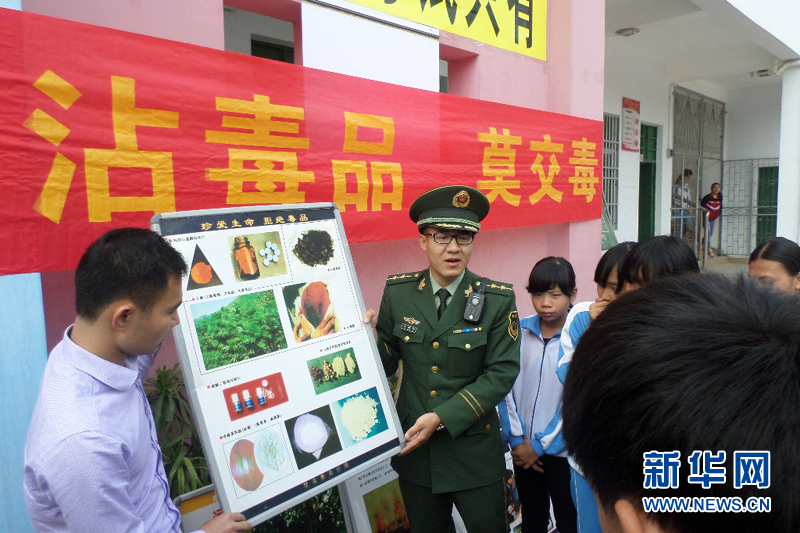 9日,海南边防总队东方边防支队联合驻地镇政府工作人员来到辖区中学,开展禁毒教育进校园活动。