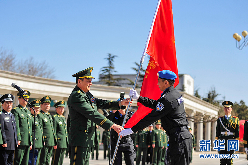 10日,中国第四支赴利比里亚维和警察防暴队在中国维和警察培训中心举行出征仪式。公安部边防管理局局长陈定武为防暴队授旗并讲话。中国人民武装警察部队学院院长马金旗、政委李乐民,公安部边防管理局副局长徐宽宥,公安部国际合作局副局长徐乃刚,公安部维和警察领导小组成员单位负责人等出席出征仪式,为防暴队送行。