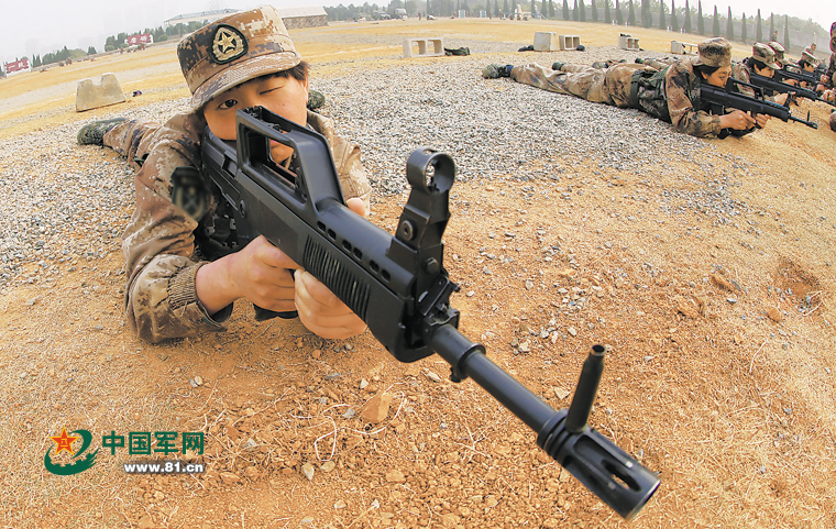 女兵楚佳琪刻苦训练强本领,在枪管上放置弹壳练瞄准。 徐浩摄