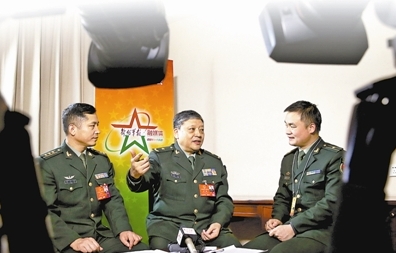 本报记者侯磊(右)正在采访军队人大代表高潮(中)、崔永军(左)。 本报记者 穆可双 摄