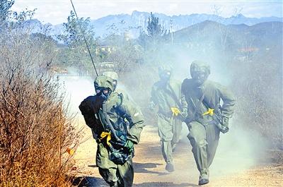 官兵快速前出进行化学毒剂 处置工作。 李凌琦 摄