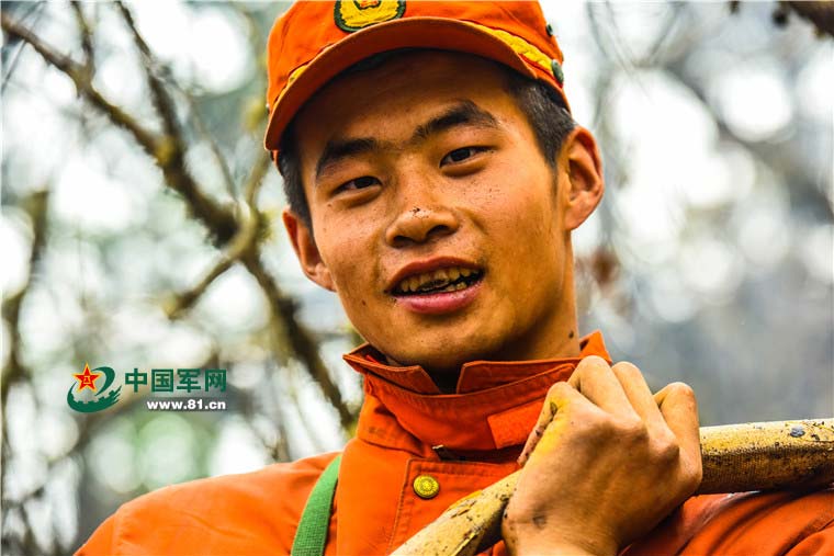 列兵刘帅的门牙在灭火中也沾上了泥土。(迟永赛 摄)