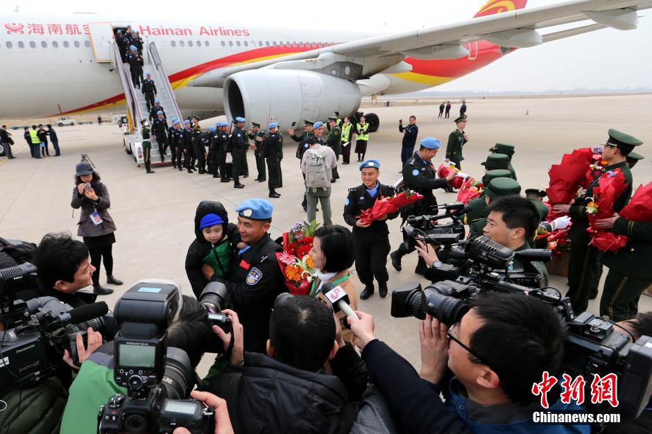 3月12日,中国第三支赴利比里亚维和警察防暴队抵达济南遥墙国际机场,圆满完成为期一年的维和任务。据悉,该支防暴队由山东公安边防总队组建,自2015年3月11日进驻任务区。 中新社记者 梁犇 摄