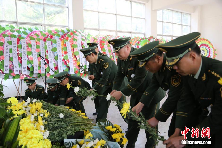 3月12日,杨军刚生前的战友送别英雄。当日,中老边境缉毒一线牺牲的杨军刚烈士追悼会,在云南省普洱市殡仪馆举行,杨军刚亲人、生前的战友及社会各界人士千余人送别英雄。杨军刚牺牲前系云南省公安边防总队普洱支队江城大队侦查队队长。3月7日,杨军刚在江城县康平镇开展毒品查缉时,与4名持枪毒贩遭遇,在战斗中身受重伤,经抢救无效牺牲。 中新社发 杨添 摄