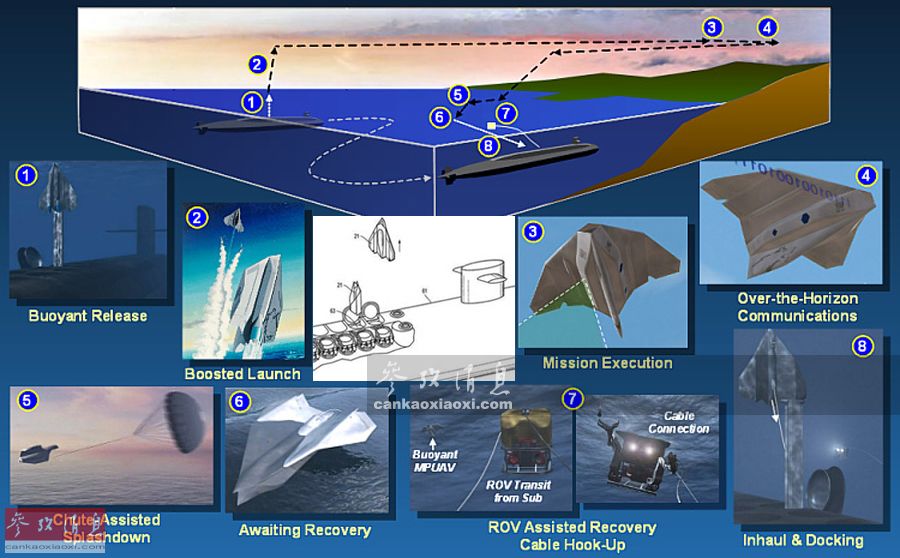 美国洛马公司曾研发过一种绰号“鸬鹚”的潜射小型无人攻击机,这种无人机可利用现役弹道导弹核潜艇的导弹发射筒从潜望镜深度发射,在完成任务后,可利用降落伞在回收地点的海面上着陆,然后由小型机器人拖回潜艇。尽管该计划已于2008年因经费问题被取消,但这种无人机或为潜水航母的发展指明了另一条可行的发展道路。小图为鸬鹚从潜艇导弹发射管发射示意图。