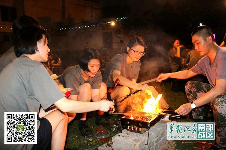 海南守岛女兵办篝火晚会 兴奋吃烧烤