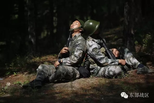 2014年6月11日,黑龙江黑河,由于连日来在酷暑条件下高强度的训练,训练间隙,两名战士背靠背在树荫下睡着了。