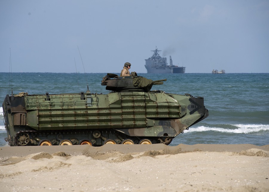 “韩美集中演练突袭登陆和占领平壤”,韩国纽西斯通讯社这样形容“双龙”登陆演练。按照计划,韩美大批登陆装备和人员在空中掩护的支援下强行在“朝鲜某预定地区”登陆,与此同时,大批部队和装备乘美国C-130运输机在“朝鲜内陆”空降。图为3月10日,韩美“双龙”联合登陆演练现场。