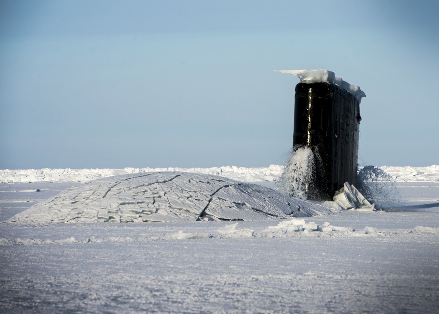 3月15日,美国海军USS Hampton号洛杉矶级核潜艇在北极圈参加代号“ICEX 2016”的军事演习,该艘潜艇从水下破冰而出,并展示了美国国旗。