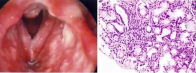 图为干燥综合征小唾液腺淋巴浸润的内镜下表现与组织病理学图像
