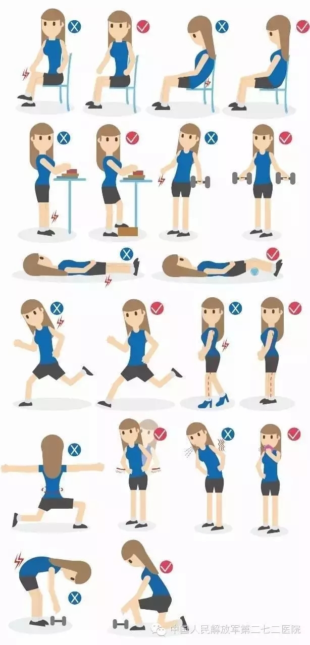 扫地、拖地时,将扫帚或拖布的把加长,直起腰来干活,以避免过度弯曲腰部,造成腰肌的劳损;淘米、择菜、洗菜、切菜、切肉时,最好不要将盆、菜板直接放在地上,或放在太低的位置,而应放高一些,保持脊柱正直,不要左右歪斜、东倚西靠,尽可能不弯曲腰部。