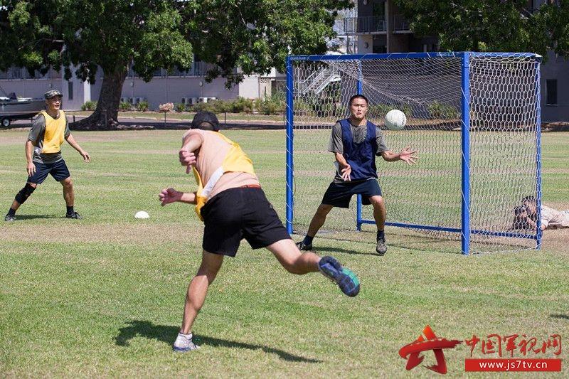 “科瓦里?2015”中澳美三边暨“熊猫袋鼠”中澳双边联合训练期间,向伟 (守门员)和外军队员一起开展文体活动。