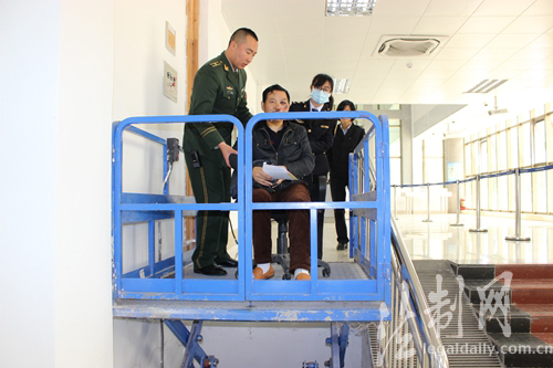 图为边检官兵护送伤者通过验证大厅