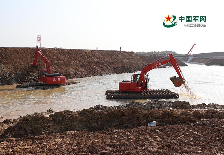 武警交通部队结合实战经验联合研发的水陆两栖挖掘机在救援中。