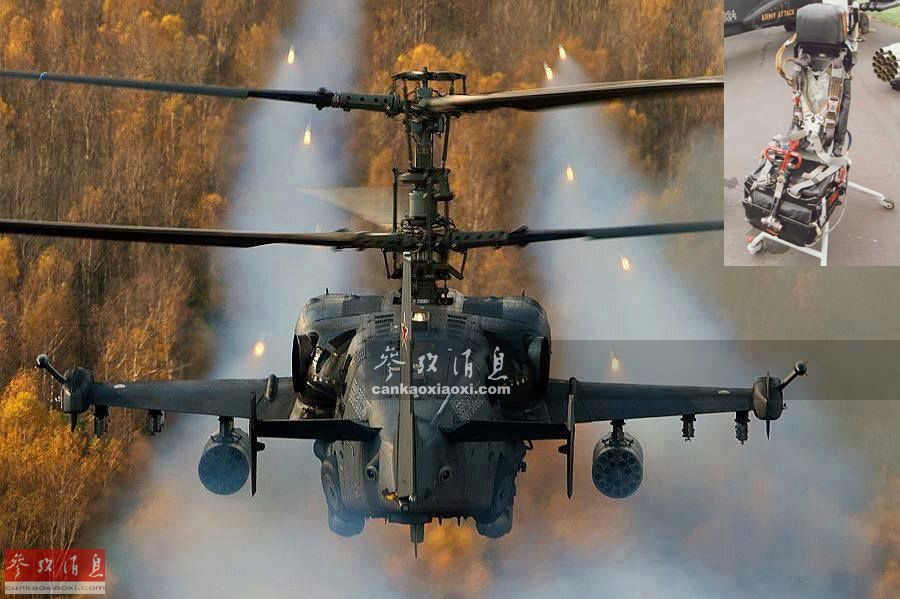 值得一提的是,卡-52沿用了卡-50的K-37火箭弹射座椅系统,是目前世界上唯一一种采用该系统的双座攻击直升机。其弹射步骤如下:先利用爆炸螺栓炸掉两副旋翼的6片奖叶,并抛弃座舱盖后,两位乘员依次启动弹射座椅,从不同方向逃生。大图为卡-52齐射S-8火箭弹。小图为卡-50、卡-52配备的K-37弹射座椅。
