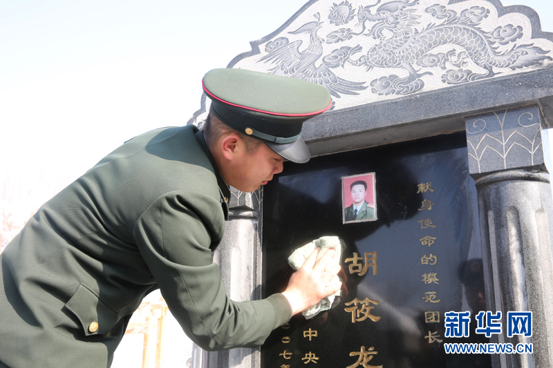 下士唐荣宏擦拭胡筱龙团长墓碑。