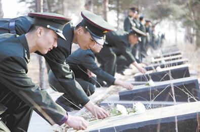 清明节前夕,驻吉林省梅河口市某部来到梅河口烈士陵园,缅怀革命先烈的丰功伟绩,接受爱国主义和革命传统教育。图为官兵向烈士献花。翁伟立摄