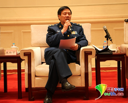 朱和平在“纪念红军长征胜利80周年,缅怀空军英烈”座谈会上发言。中国青年网记者 开可摄