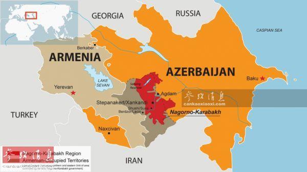 阿塞拜疆与亚美尼亚冲突示意图,红色部分为纳卡地区。