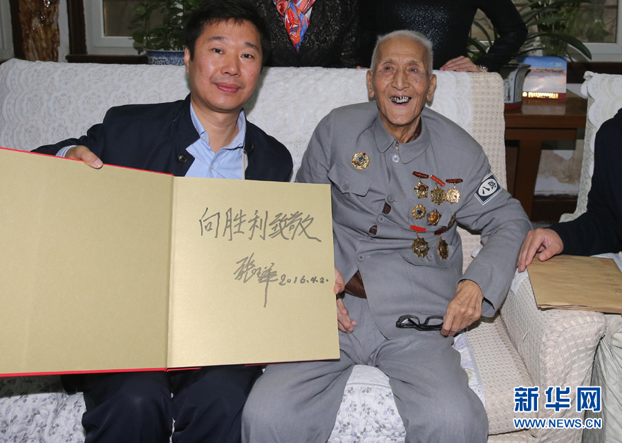 百岁老兵张玉华为画册题写“向胜利致敬”。冯敬 摄