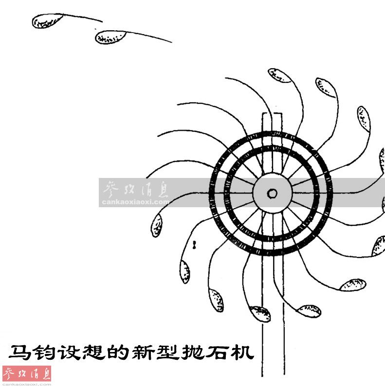 公元239年,曹睿病重托孤,皇室宗亲、大将军曹爽一时权倾朝野。时任魏国给事中(宫廷政务顾问)的发明家马钧为加强军备,针对传统抛石机发射效率低下的问题,大胆提出“在巨型木轮上挂装多颗石弹,利用木轮旋转产生的巨大离心力为石弹提供加速动能,然后在特定位置突然割断绳索,令石弹风驰电掣般飞击敌城”的设想。