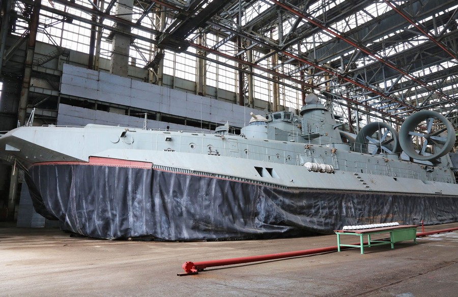 近日,俄罗斯副总理罗戈津视察了位于克里米亚的大海造船厂,船坞中一艘“野牛”气垫船正在等待维修。“野牛”气垫登陆舰是目前世界上最大的气垫船。中国曾与克里米亚“大海”造船厂签署了合同,购买2艘并仿制两艘该型气垫船。