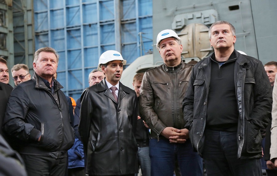 近日,俄罗斯副总理罗戈津视察了位于克里米亚的大海造船厂,船坞中一艘“野牛”气垫船正在等待维修。“野牛”气垫登陆舰是目前世界上最大的气垫船。中国曾与克里米亚“大海”造船厂签署了合同,购买2艘并仿制两艘该型气垫船。