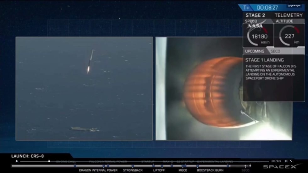 美国东部时间下午4时43分(北京时间9日早晨4时43分),“猎鹰9”火箭搭载“龙”飞船从佛罗里达州卡纳维拉尔角空军基地升空。约10分钟后,飞船与火箭成功分离,进入预定轨道。