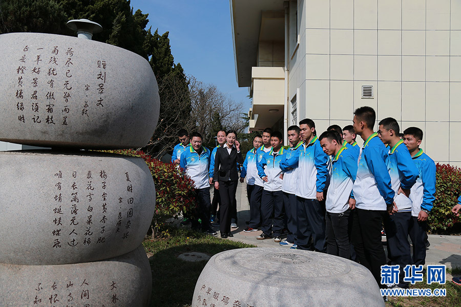 官兵们参观“四时养生”文化石鼓。侯升嵩 摄