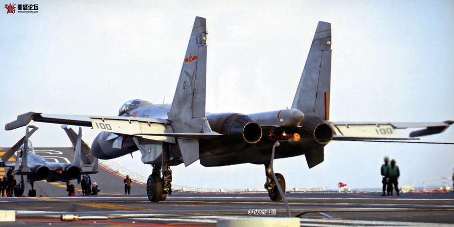 近日,歼-15舰载机在辽宁舰航母上最新的训练画面再次曝光。图为歼-15舰载机成功着舰,尾钩牢牢勾住拦阻索。(扫图鸣谢:鼎盛军事 边城)