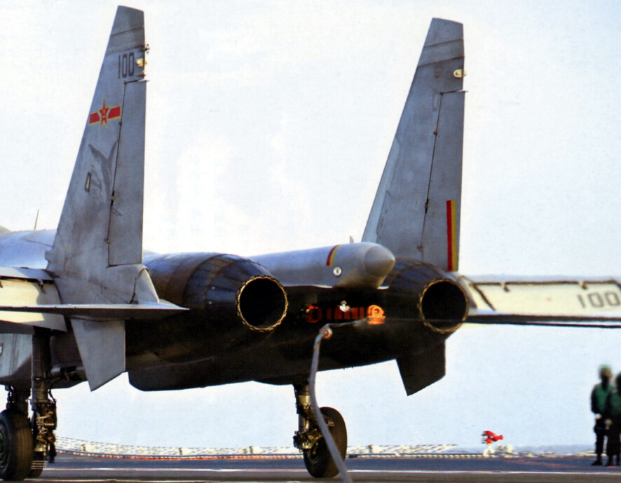 近日,歼-15舰载机在辽宁舰航母上最新的训练画面再次曝光。图为歼-15舰载机成功着舰,尾钩牢牢勾住拦阻索。(扫图鸣谢:鼎盛军事 边城)