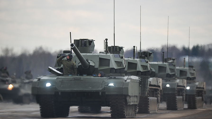 当地时间4月11日,俄在莫斯科近郊举行庆祝伟大卫国战争胜利71周年阅兵式首次彩排。图为受阅的新型“阿玛塔”坦克方队。(网页截图)