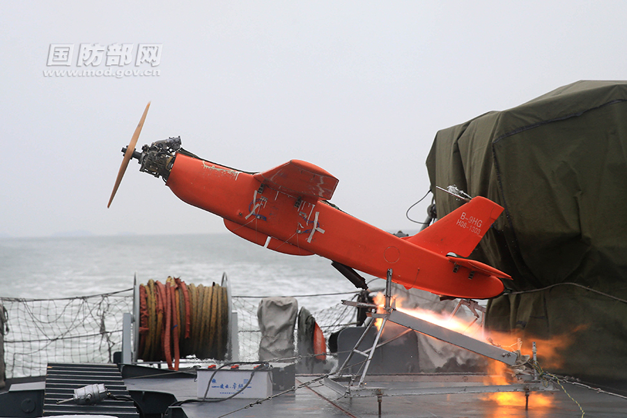 4月10日,海军东海舰队某护卫舰大队进行副炮对空射击训练。图为施放靶机。