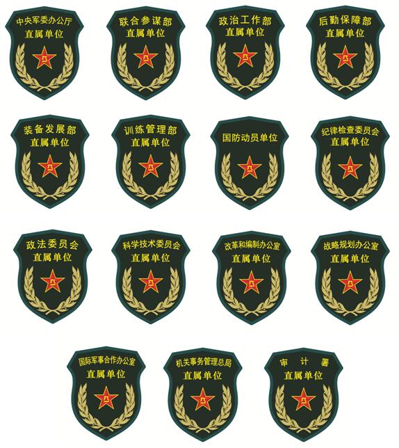 中央军委办事机构直属单位臂章设计。中央军委机关直属单位受相应的中央军委办事机构领导,工作职能通常也是面向全军的,因此主标志采用红黄双色“八一”五星军徽,臂章中标注的“××直属单位”并非指某一个单位,而是同类直属单位的统称。佩带同一种“××直属单位”臂章的官兵可能来自好几个不同单位。