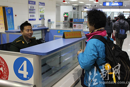 图为党员先锋示范岗用微笑服务旅客