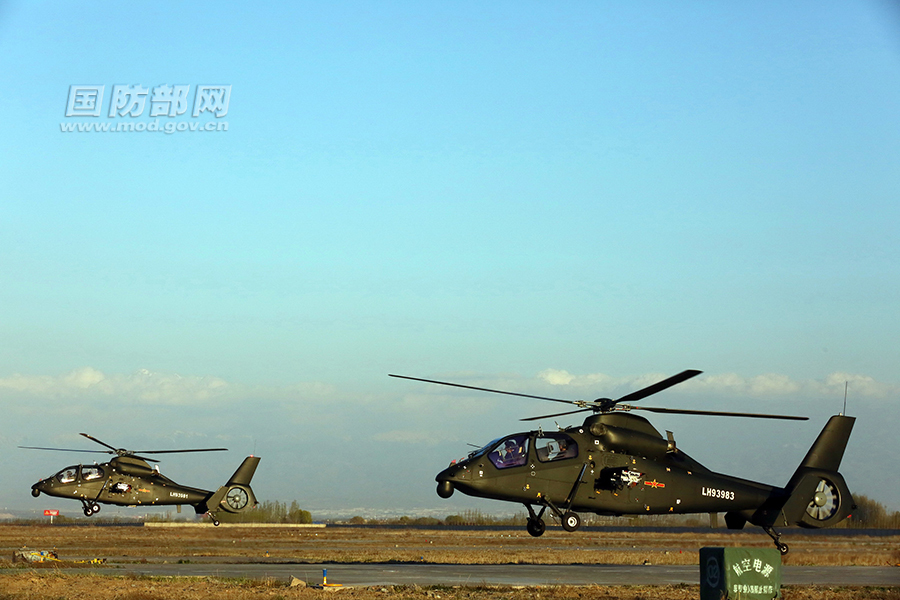 武装直升机掠地飞行。