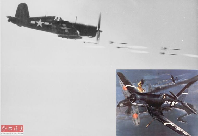 在战争后期,美海军还投入了F4U“海盗”这种具有一定多用途(对地和对空作战性能都很突出的)性能的攻击机,特别是在支援美军两栖夺岛作战时发挥了很大作用,与战列舰相比,它们更为灵活,而且能深入岛屿内部支援美军地面部队。大图为冲绳战役中的F4U攻击机对地发射火箭弹。