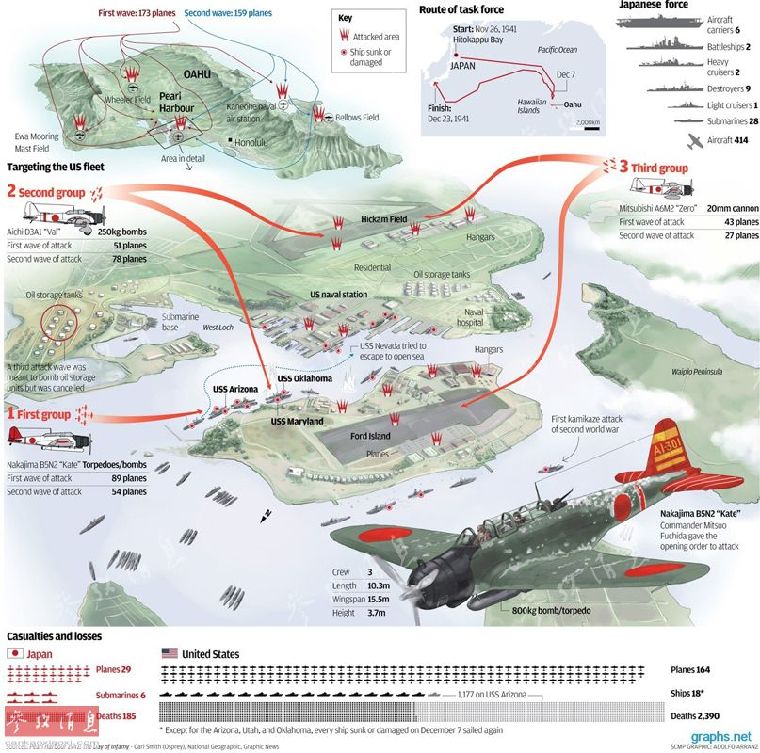 在1942年12月7日的珍珠港事件之后,美海军进一步意识到了航母对制海作战的重要性,加大了在建造航母领域的投入,后来逐渐把航母从一种战术武器变为了一种战略工具。这就为接下来当时两大海军的航母对决奠定了基础。图为日军偷袭珍珠港示意图。