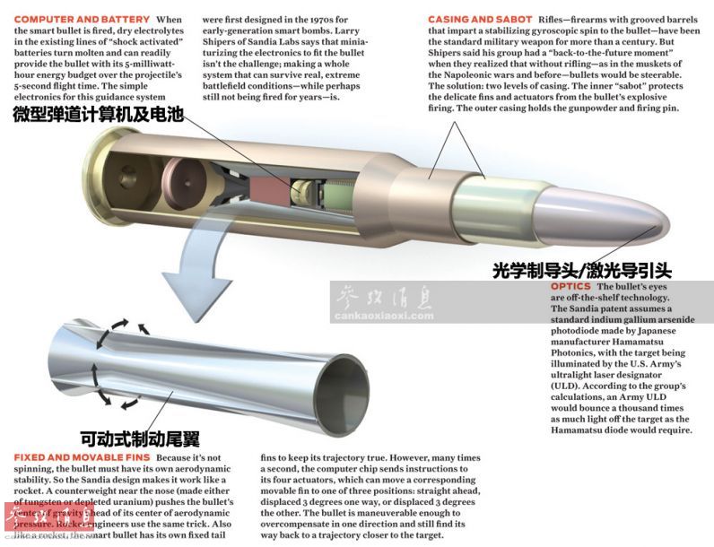 该项目由美国洛克希德·马丁公司和桑迪亚国家实验室共同负责。2012年2月初,洛·马公司宣布,他们已研发出了一种形似飞镖的激光制导子弹。前端有一个光学传感器,用于搜索、追踪射向目标的激光制导点,内部传感器能将目标的数据实时传送给制导和指挥元件,后者可以通过一个8位的中央处理器计算出理想的飞行弹道并控制电磁传动装置。图为“精确制导子弹”剖面图。