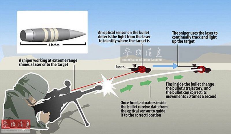 图中直观展示了激光制导子弹的交战全过程,狙击手在射击前,只需持续性用激光照射标记目标即可,无需再保持传统的”三点一线“瞄准方式,开枪后,制导子弹会和制导炸弹一样,自动跟踪目标直至命中,十分适合攻击远程移动目标。