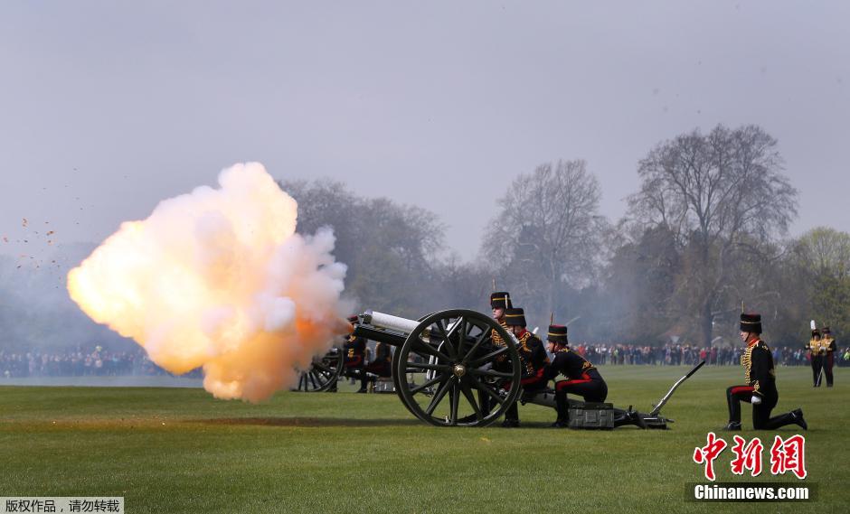 当地时间4月21日,英国伦敦皇家骑马炮兵团的国王仪仗队在当地海德公园内鸣响41声礼炮,庆祝英国女王伊丽莎白二世90大寿。